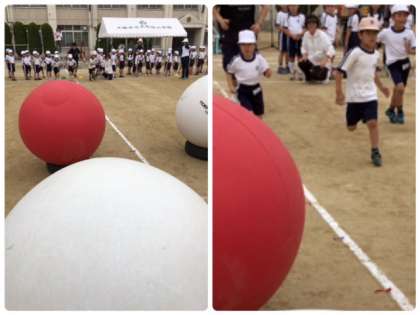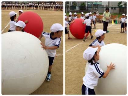この競技は、全児童が4つの組に分かれて、大玉を送ります。1年生から3年生は大玉をコロコロと転がし、4年生から6年生は、大玉を頭の上で送ります。