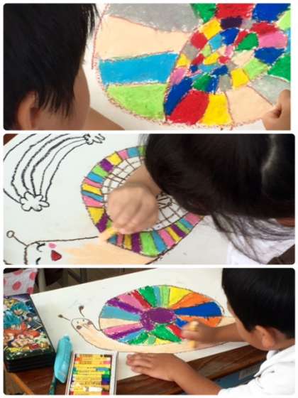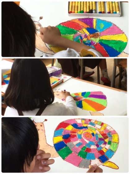 1年2組は図工です。パスを使って「おしゃれなカタツムリ」を描いています。