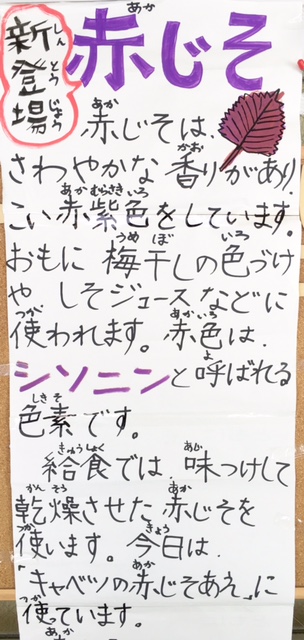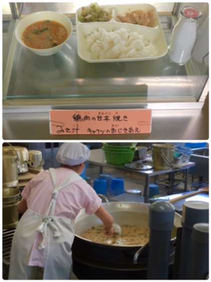 今日の献立は、鶏肉の甘辛焼、キャベツの赤ジソ和え、味噌汁、ごはん、牛乳です。