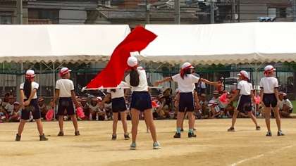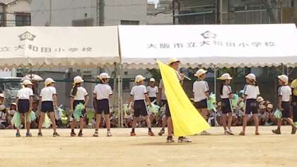 午後の部、プログラム19「スウェーデンリレー」のリハーサルです。1年生から6年生まで、各チーム代表児童がバトンをつなぎ競います。