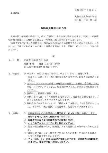 本日は、残念ながら雨天のため運動会を中止し、延期いたしました。つきましては、保護者の皆様に児童を通じて「運動会延期のお知らせ」を配付いたしました。