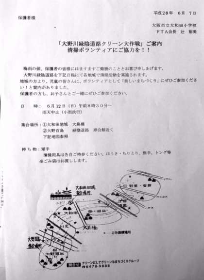 本日、PTAより「大野川緑陰道路クリーン大作戦」ご案内 清掃ボランティアに協力を!のお手紙を配付いたしました。