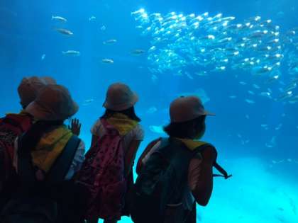 太平洋の大きな水槽でジンベエザメと大接近!イワシの群れを見て、スイミーみたい!