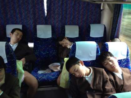 帰りのバスに乗るやいなや、みんなダウンです。昨日は遅くまでおしゃべりをしていたのかな?楽しい思い出の夢を見ているのでしょうか。しあわせそうな寝顔です。おうちに帰ってからは、思い出話をいっぱいしてくださいね。