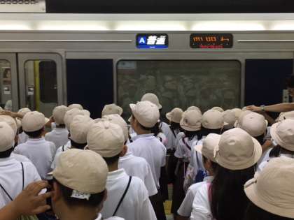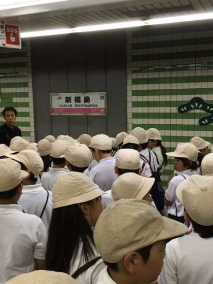 新福島駅から東西線に乗りました。4年生の児童はとてもマナーよく乗車できています。
