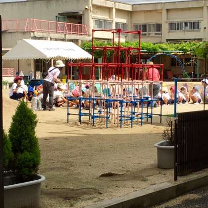 本校と大和田幼稚園はフェンスで区切られていますが、平成25年度にフェンスの一部を切り取り、津波等の水害の恐れがあるときには、幼稚園児が一刻も早く避難できるよう改善しました。