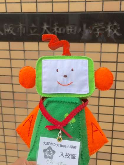 ぐろーばーさんは、首から入校証をぶら下げています。ぐろーばーさんは「大和田小学校の子どもたちが未来に向けて世界に飛び立てる力をつけるために、しっかり勉強してほしいです」と話してくれました。