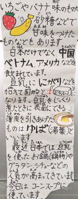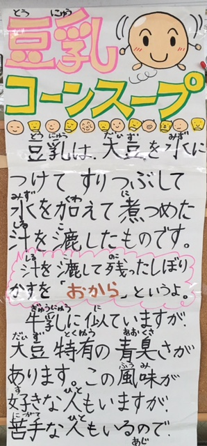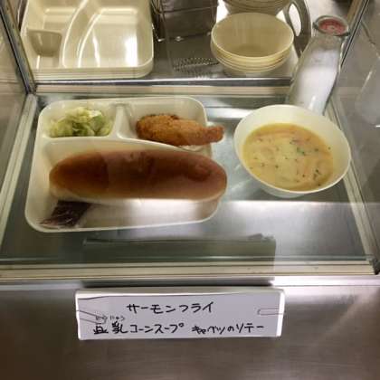 今日の献立は、サーモンフライ、豆乳スープ、キャベツのソテー、大型コッペパン、牛乳です。