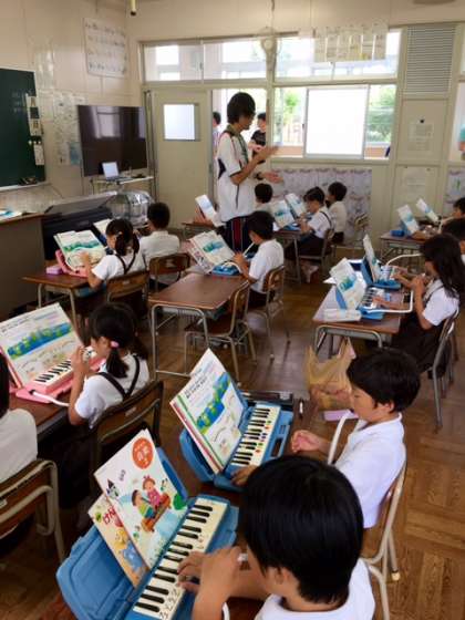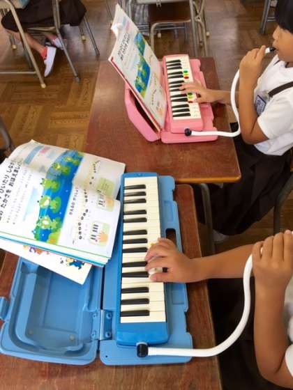 1時間目、2年1組音楽 器楽(鍵盤ハーモニカ)で「かえるの合唱」です。