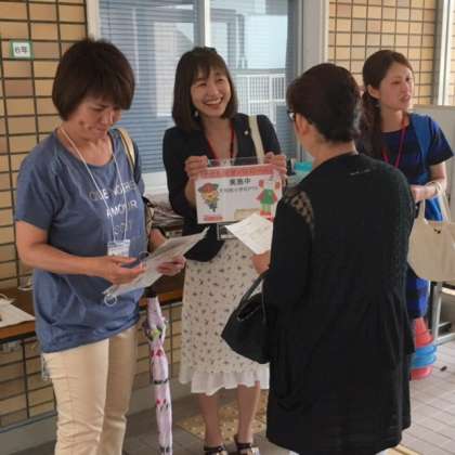 PTAマスコットキャラクターの「ぐろーばー」と西淀川区のマスコットキャラクター「にーよん」のデザインされた自転車前かご等に付けていただく巡視札を配付されました。