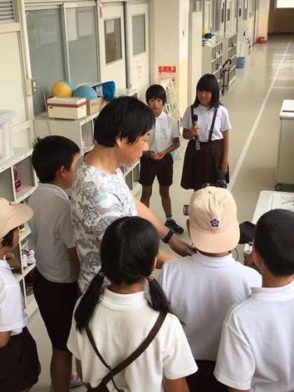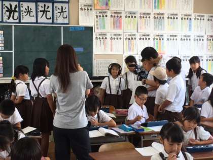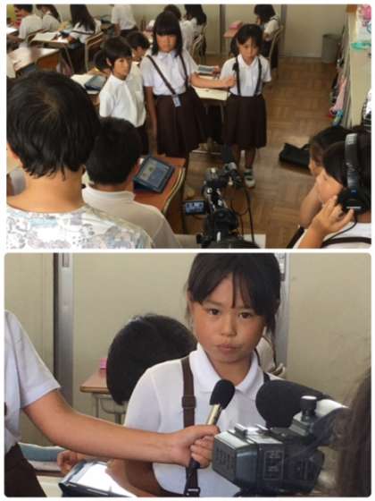 5年2組の子どもたちは、芝生広場に続いて4年1組の教室で、タブレットパソコンを使った授業を収録しました。
