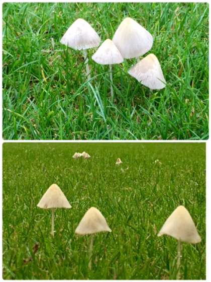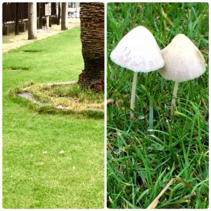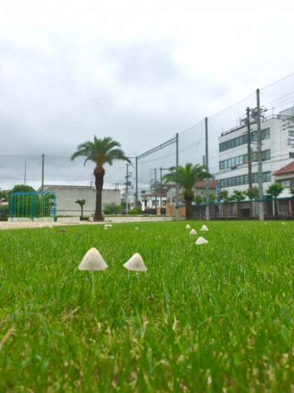 おはようございます。梅雨本番、よく雨が降ります。恵の雨、草木が伸長します。芝生広場も雨続きで、キノコが時折見られます。理科の専門家の藤浪先生と図書室の図鑑で調べました。「クヌギタケ」の仲間(毒はありません。美味しくないそうです。)と思われます。