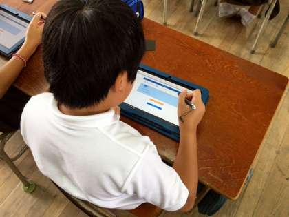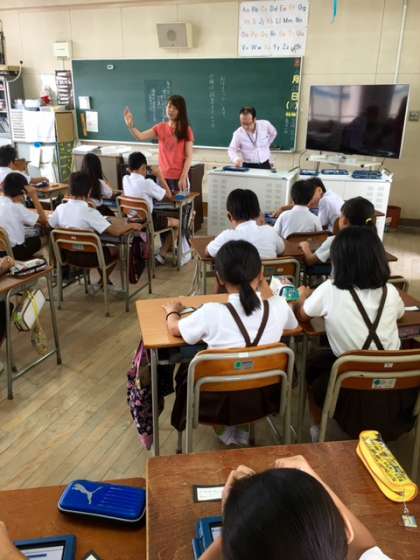 5年2組は、タブレットパソコンのアンケートを受けています。担任の福間先生とICT支援員の泉先生がサポートしています。