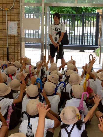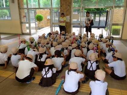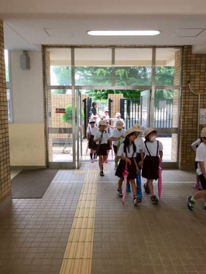 2年生が「町たんけん」から帰ってきました。途中パラパラと雨が落ちてきましたが、傘をさす程でなく良かったです。子どもたちは、交通ルールやマナーを守ることができたと手を上げていました。