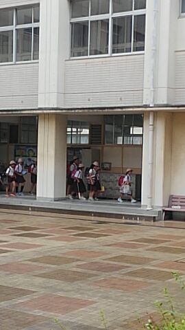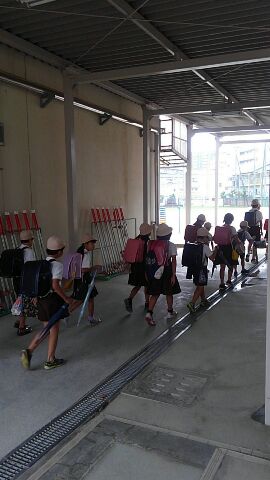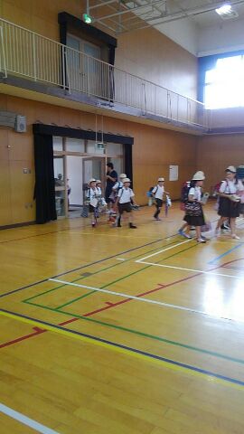 3階以上の各教室で集まった後、各地区の子どもたちは講堂へ移動します。