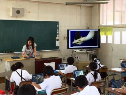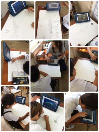 3年2組は図工の時間です。先日、3年生は社会見学で海遊館に行きました。その時の印象を具体化してそれぞれがタブレットパソコンで検索しながらお気に入りの魚を描いています。大型ディスプレイに映し出される映像はとても綺麗で、2回海遊館に行ったように感じます。