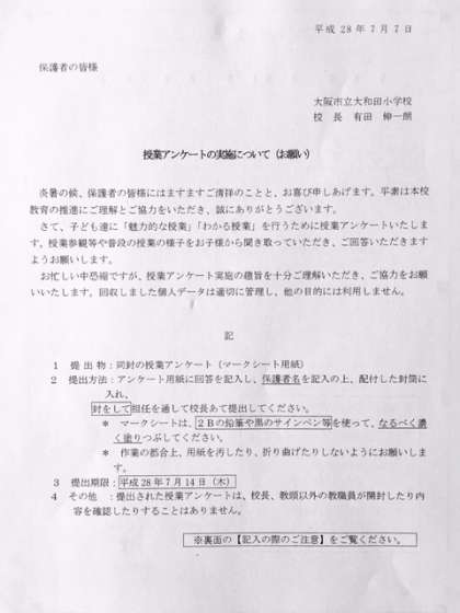 本日、お子様を通じて保護者の皆様に「授業アンケートの実施について」のお手紙、アンケート用紙、提出用封筒を配付します。