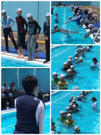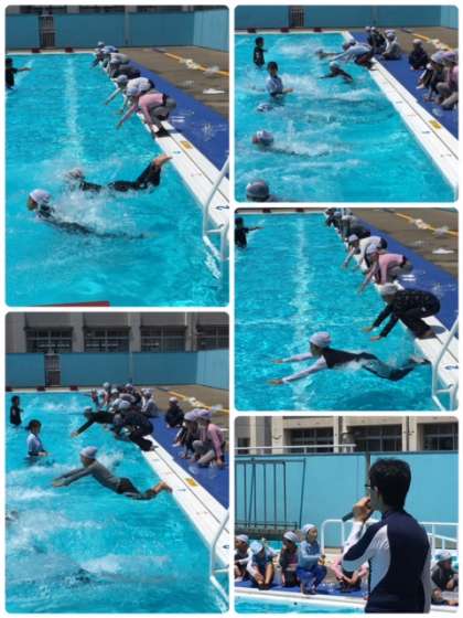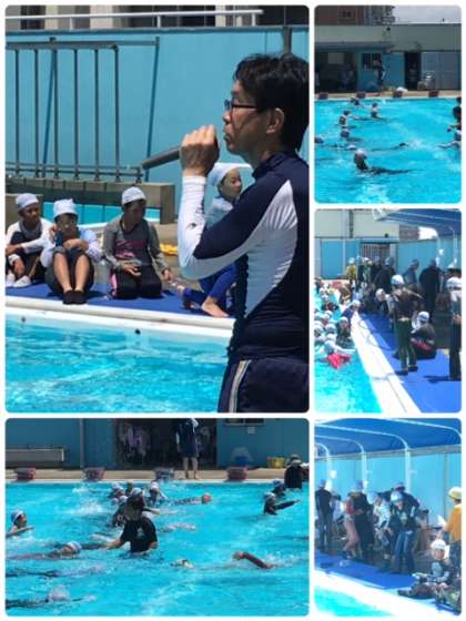 プールサイドから落ちた体験をしました。小山教頭先生が、子どもたちに問いかけます。「もし、水に落ちたらどうしたらいいですか?」子どもたちが答えます「慌てず、冷静に今の状況を考えます」