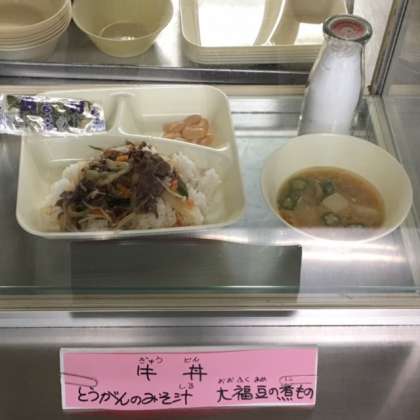 今日の献立は、牛丼、大福豆の煮物、冬瓜の味噌汁、牛乳です。