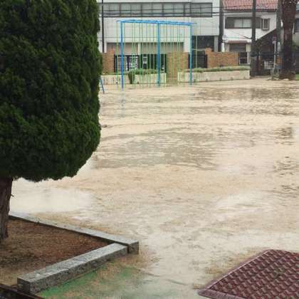 子どもたちの登校後に、少し激しい雨が降っています。プールは入れるでしょうか?様子を見ています。