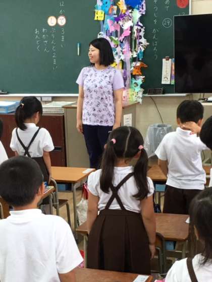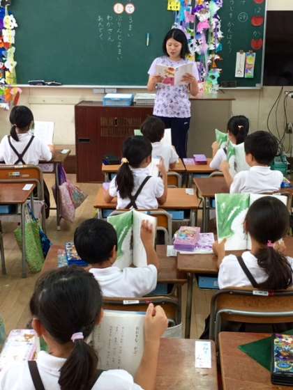 1年2組が1時間目、国語の授業がはじまりました。最初は、守島先生に続いて音読しています。
