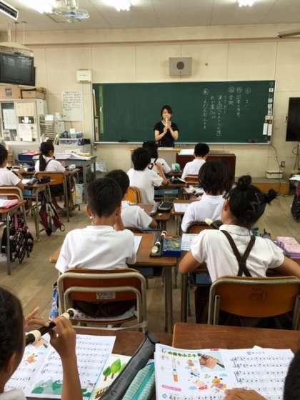 3年2組が音楽の授業でリコーダーを教えてもらっています。いよいよ、高いレの音を習います。少し難しくなりました。
