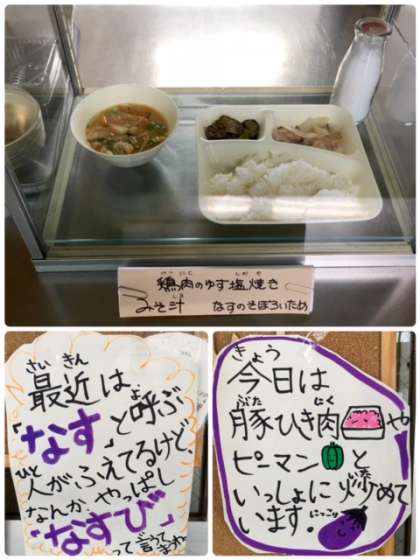 さて、今日の献立は鶏肉の柚子塩焼き、ナスのそぼろ炒め、味噌汁、ごはん、牛乳でした。