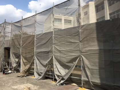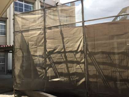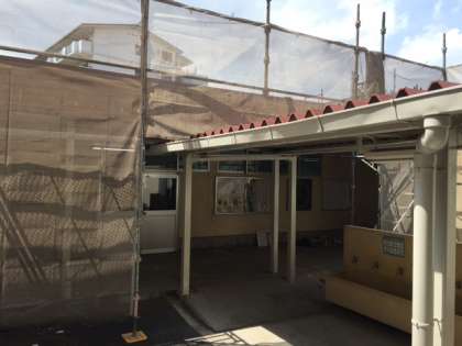 夏休みに入って、給食室の屋根の工事が始まりました。夏休み中学校に登校した時は、危険ですから給食室に近づかないようにしてください。