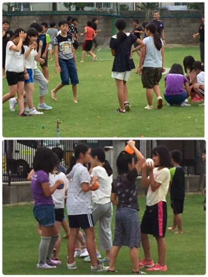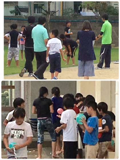 朝ごはんの後は、芝生広場で水あそびをしました。日ごろ水風船など学校ではできない遊びを夢中になって楽しんでいます。