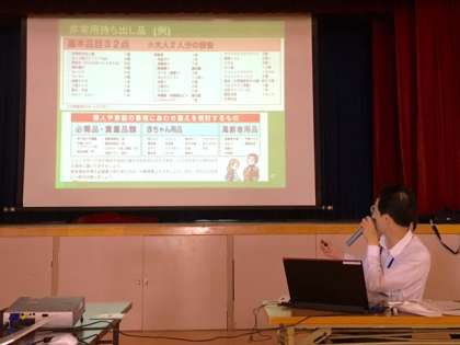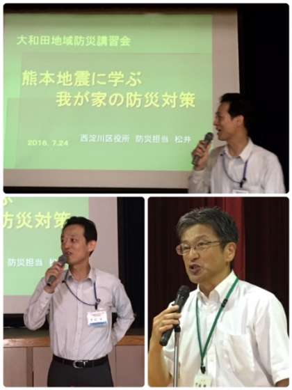 防災講習会では、西淀川区クリーンにしてグリーンなまちづくり課防災担当松井一生係長様を講師に迎え、今年4月の熊本地震の支援に熊本市にいらした体験をもとにお話しくださいました。