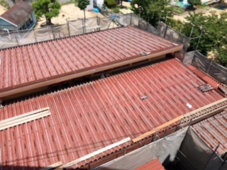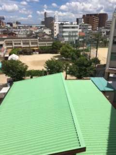 夏休み中給食室を改修しました。屋根や天井を中心に改修しました以前は赤い屋根でしたが、2学期からは給食室の屋根はエメラルドグリーンです。