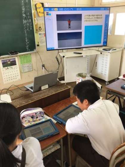 5年1組はタブレットパソコンを使って総合の学習をしています。