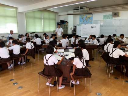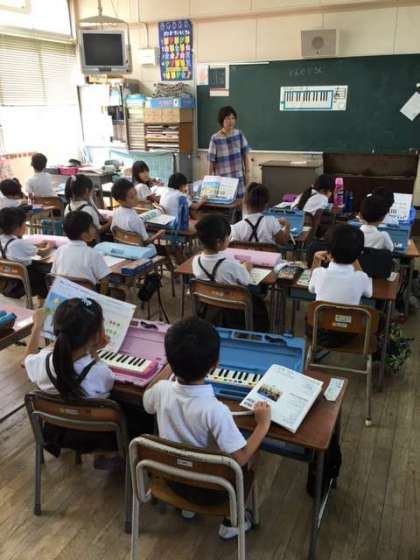 1年1組は教室で、4年2組音楽室で音楽の学習をしています。