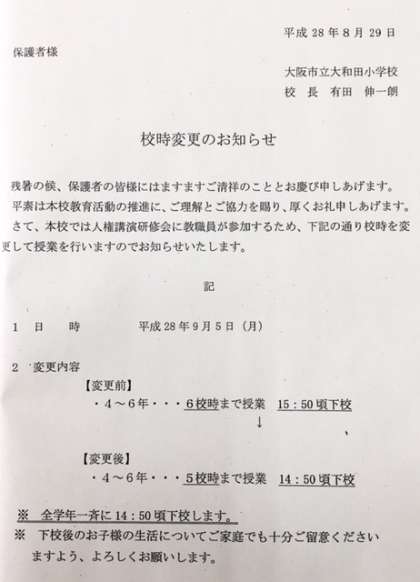 8月29日付の配付プリントでお知らせしました「校時変更のお知らせ」にありました通り、教職員を人権研修会に参加させるため、児童は5時間目終了後、14時50分頃下校します。よろしくお願いします。