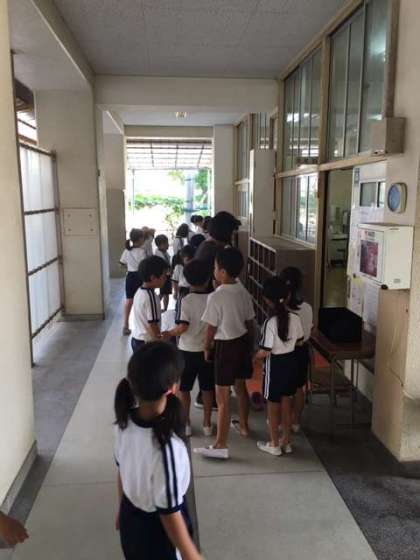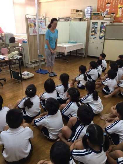 2時間目、1年2組が発育測定をしに保健室へ来ました。とても行儀よく保健室の西嶋先生の話をしっかりと聞けています。