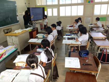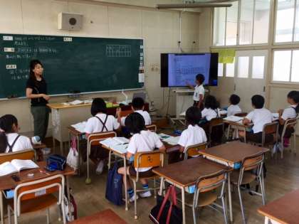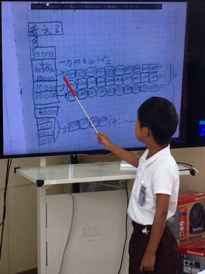 3年2組の教室でも、少人数授業で算数の学習をしています。ノートを書画カメラで写して、自分の考え方を説明することができます。