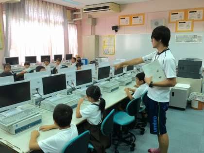 2年1組ははじめてパソコン室で授業を受けます。子どもたちはドキドキしています。