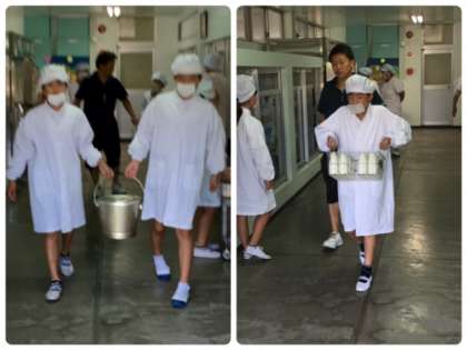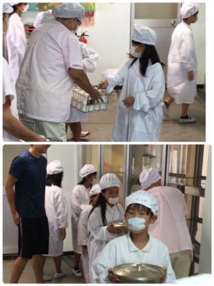 給食の時間になりました。給食当番さんが次々と給食室にやってきます。さぁ、美味しい給食をたっぷり召し上がれ。