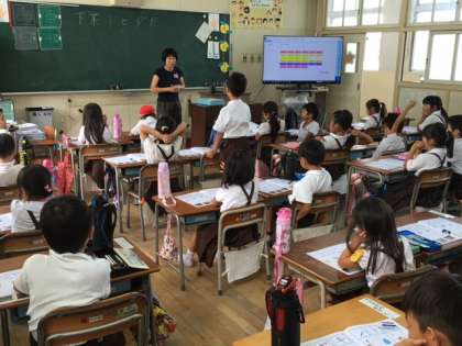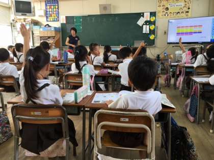 1年1組国語の授業です。どの子どもたちも積極的に学習に取り組んでいます。