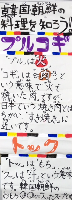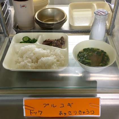 さて、今日の給食は、プルコギ、トック、あっさりキュウリ、ごはん、牛乳です。