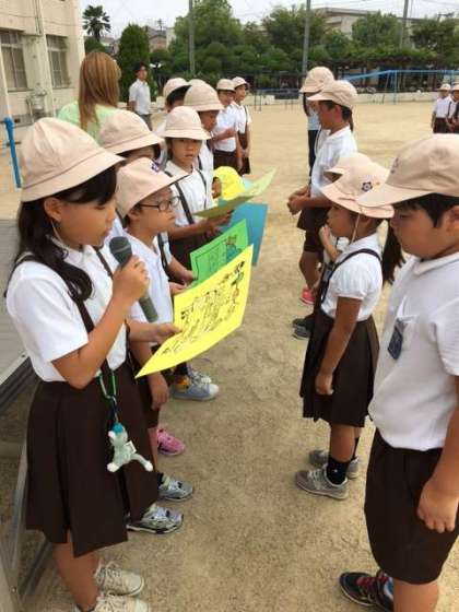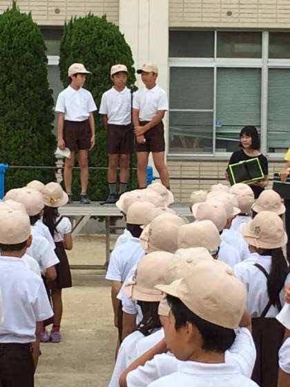 おはようございます。月曜日の朝は、全校児童が運動場に集まって児童朝会を行っています。