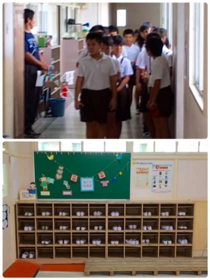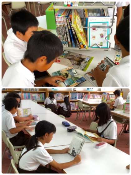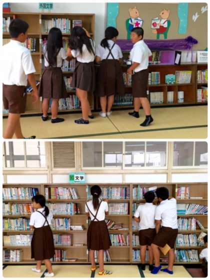 1時間目のはじめ、校舎を歩いていたら5年1組の子どもたちが廊下に整列していました。とても整然として立派です。移動教室と思いついて行きました。図書室で図書の時間です。靴箱に上履きをキチンと収納し授業がはじまりました。
