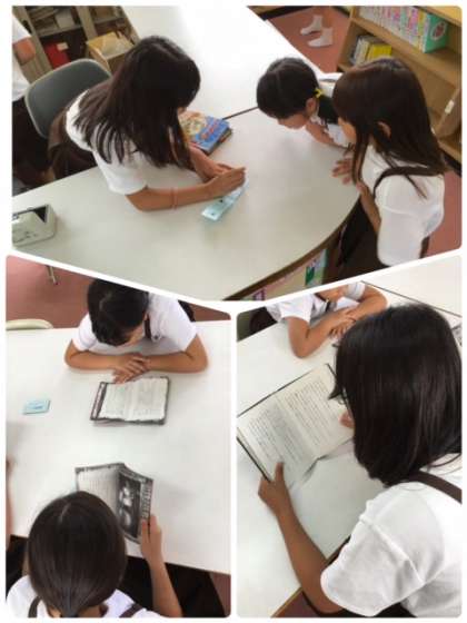 今日は火曜日、図書館指導員さんの吉成先生が来てくださっています。雨なので20分休憩に図書室で本を読んでいる子どもたちがいます。子どもたちに「どんな本を読んでいるの?」と聞くと。「恐い話しを読んでいます」「夏の暑い時には、涼しくなってぴったりです」と教えてくれました。