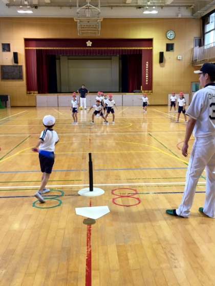 いよいよゲームがはじまりました。どの子も楽しそうにTボールを体験しています。