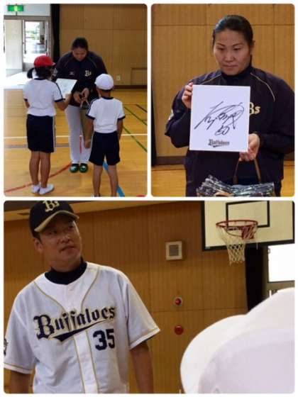 児童から「どんなチームと試合をしましたか?」の質問に「すべてのチームと試合をしました。皆さんはプロ野球のチームをすべて言えますか?」と子どもたちに問いかけてくださいました。オリックス・バファローズのファンですと言っていた児童は、目を丸くして喜んでいました。最後にオリックス・バファローズから、サイン色紙(#50 小田裕也外野手)やオリックス・バファローズのナップサックなどプレゼントをいただきました。