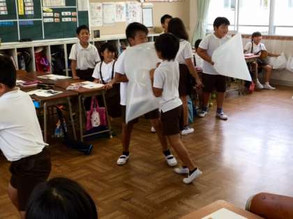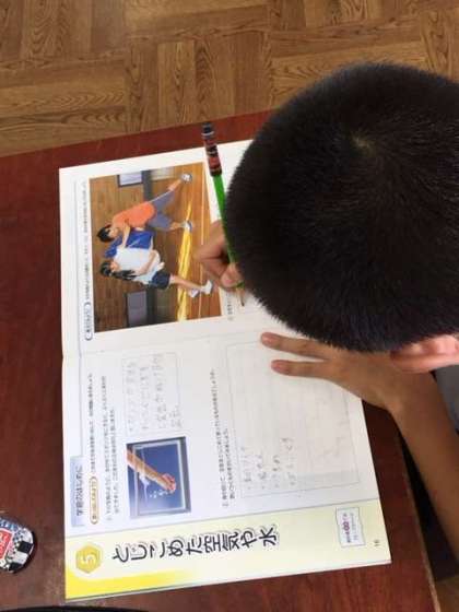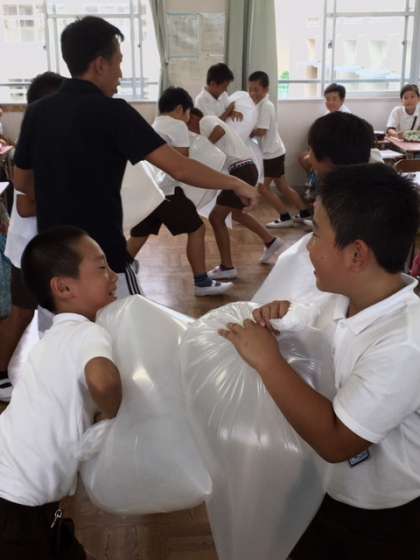 フォニックスの時間が終わりました。廊下を歩いていると、4年生の教室からにぎやかな声が聞こえてきます。休み時間の延長かな?と、4年1組の教室に行くと、5時間目の理科の授業が始まっていました。「とじこめた空気と水」の単元の導入で実験をしていました。空気は目に見えません。そこで、大きなビニール袋に空気をとじこめて互いにぶつかりあっています。実際に実験をすることによって、目に見えない空気を感じたようです。実験のあとは、それぞれが気づいたことをノートに書いて、発表です