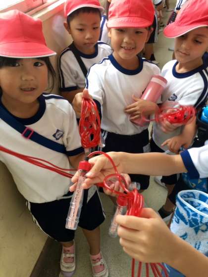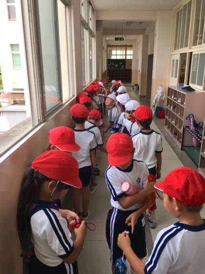 1年1組の子どもたちが廊下に並んでいます。よく見ると先生はいないのに自分たちで並べています。