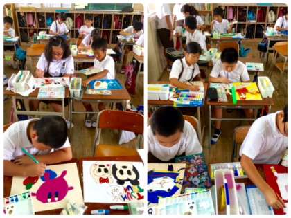 5年1組の図工の授業です。どの子も一所懸命に絵を描いています。担任の大西先生も熱中しています。いい風景です。
