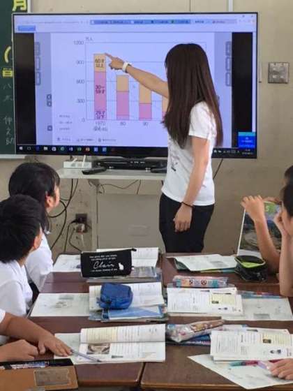 5年2組は社会の授業です。担任の福間先生は大型ディスプレイにグラフを映して教えてくださっています。子どもたちはグループを組んで、先生の質問に積極的に答えています。ICTの導入で、授業も変わりました。