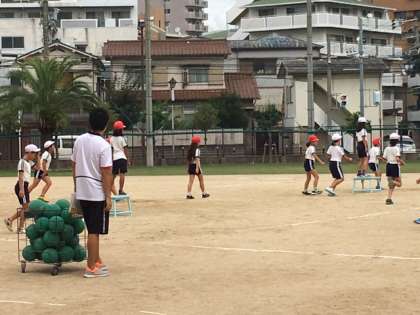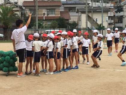 4年2組もボールゲームをしています。担任の鈴木先生が集合の号令をかけると、子どもたちは一目散に集まって整列しました。キビキビして気持ち良いです。
